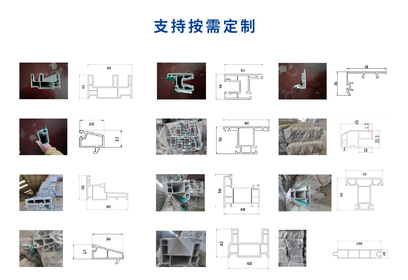 PVC異型材模具:PVC塑鋼門(mén)窗、平開(kāi)門(mén)窗、推拉門(mén)窗、護(hù)欄、線(xiàn)槽等。